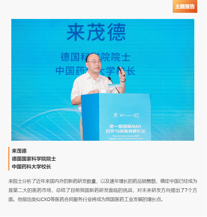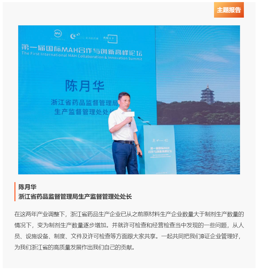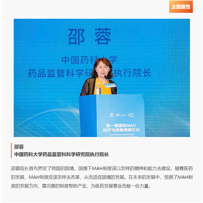 2022年7月22日-23日,由中国药学会、中华全国工商业联合会医药业商会、浙江省药品监督管理局、浙江省医疗保障研究会、杭州市经济和信息化局以及杭州市钱塘区人民政府支持,浙江省药品上市许可持有人转化平台主办的“第一届国际MAH合作与创新高峰论坛(简称“论坛”)”在杭州举行。