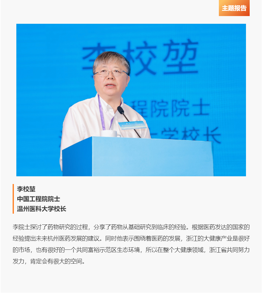 大会邀请到国家药品监督管理局副局长陈时飞,中国工程院院士、温州医科大学校长李校堃院士,德国国家科学院院士、中国药科大学校长来茂德院士,中国药科大学药品监管科学研究院执行院长邵蓉,中共杭州市钱塘区委书记金承涛,以及浙江省政协常委、省医疗保障研究会会长、省医保局原局长杨烨等嘉宾出席会议。
